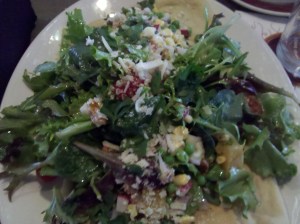 The “Sheet Music Salad” included “mixed greens, peas, radishes, corn, golden beets, candied pecans, house vinaigrette, and herbed crisp.” I kind of ordered it so that I could try as many fresh farm products on one plate as possible. It was a truly amazing salad. The salad greens were delicious, with lettuce leaves about the size of my thumb, which made me think that we really need to seed lettuce more frequently and harvest it smaller, because it really does make a superior salad that way. The golden beets were cooked and cut in little cubes so that they didn’t look very beetlike at all, and didn’t overwhelm the salad the way a red beet might. I really like both golden beets and chiogga beets for this reason, they don’t bleed all over the place and turn all of your food red. On our farm we’ve found the golden ones a little trickier to germinate consistently than the red varieties though. The “herbed crisp” was another awesome thing about this salad. The whole thing was basically served on top of a thin, crunchy piece of bread, that we broke off and ate with our salad for a satisfying crunchy mix of lettuce crunch and crackery bread crunch. Yum.