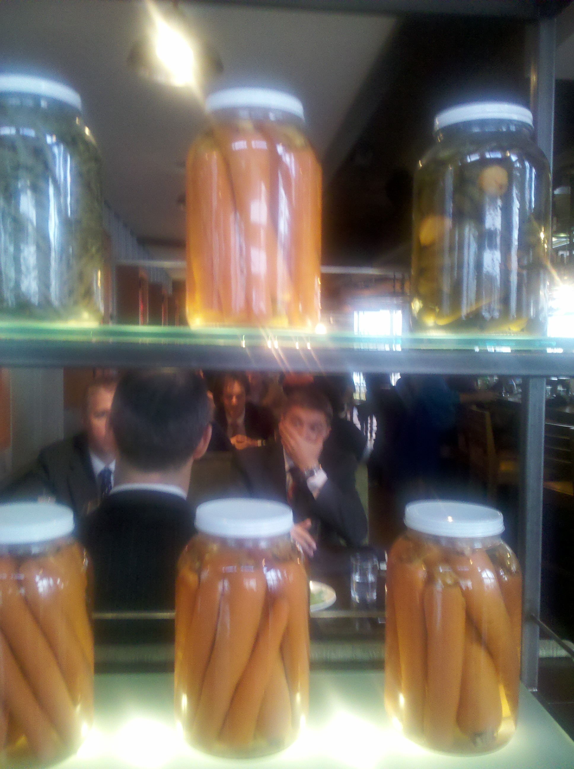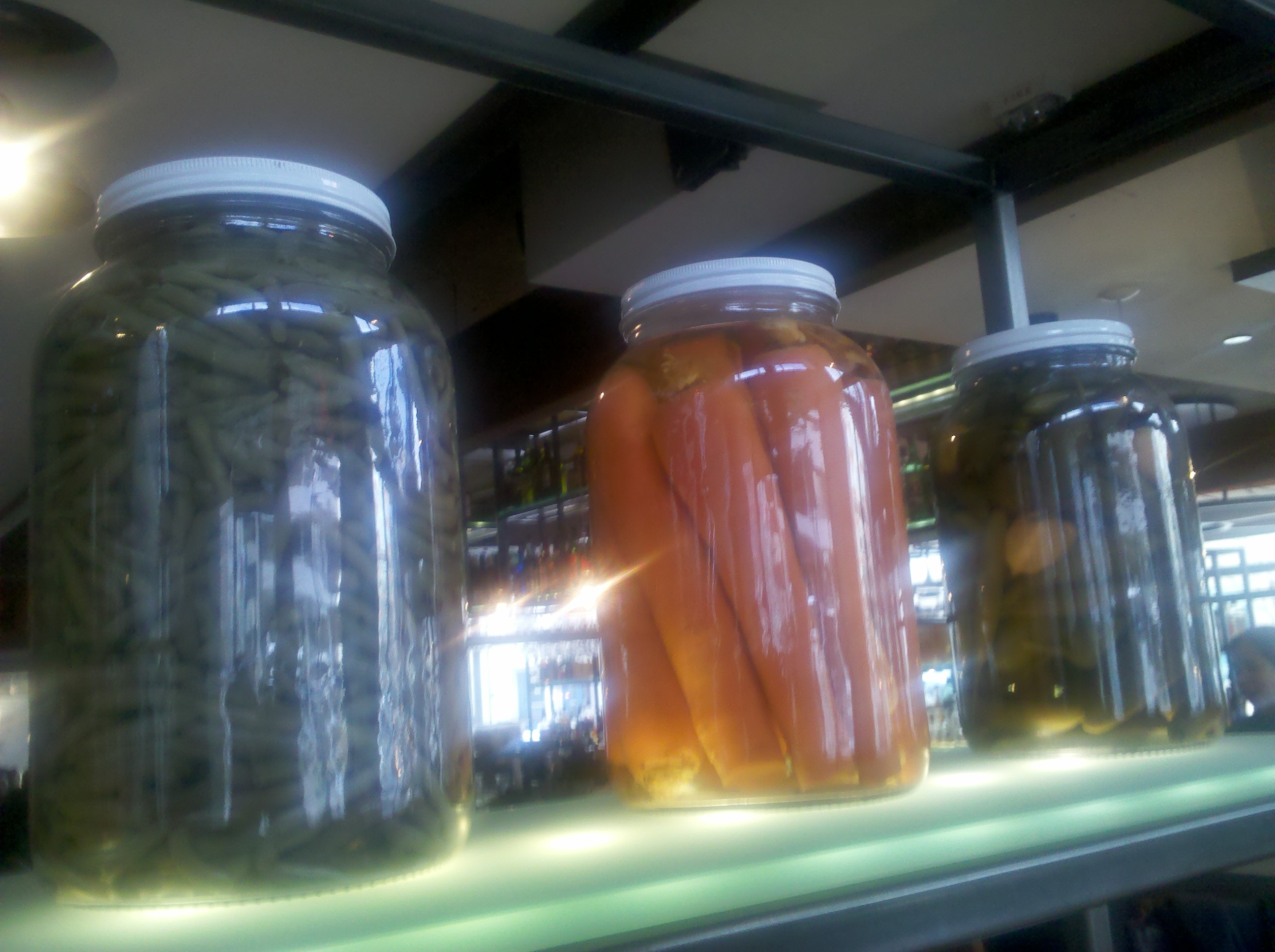 Corporate guys in suits that is, lunching behind giant canned jars of carrots and other goodies, is what you see as you walk in the door. (That, and hungry diners waiting for tables, a sure sign it must be good.) In Idaho hardly anyone ever wears a suit, and these guys seemed so far removed from farms that it made me smile. Are they concerned with supporting farmers, or is the food just really good? Also I’ve never heard of canning carrots, will have to try that some time, and I’m not sure whether the restaurant will be serving these up at some point, or if they’re just for decoration.