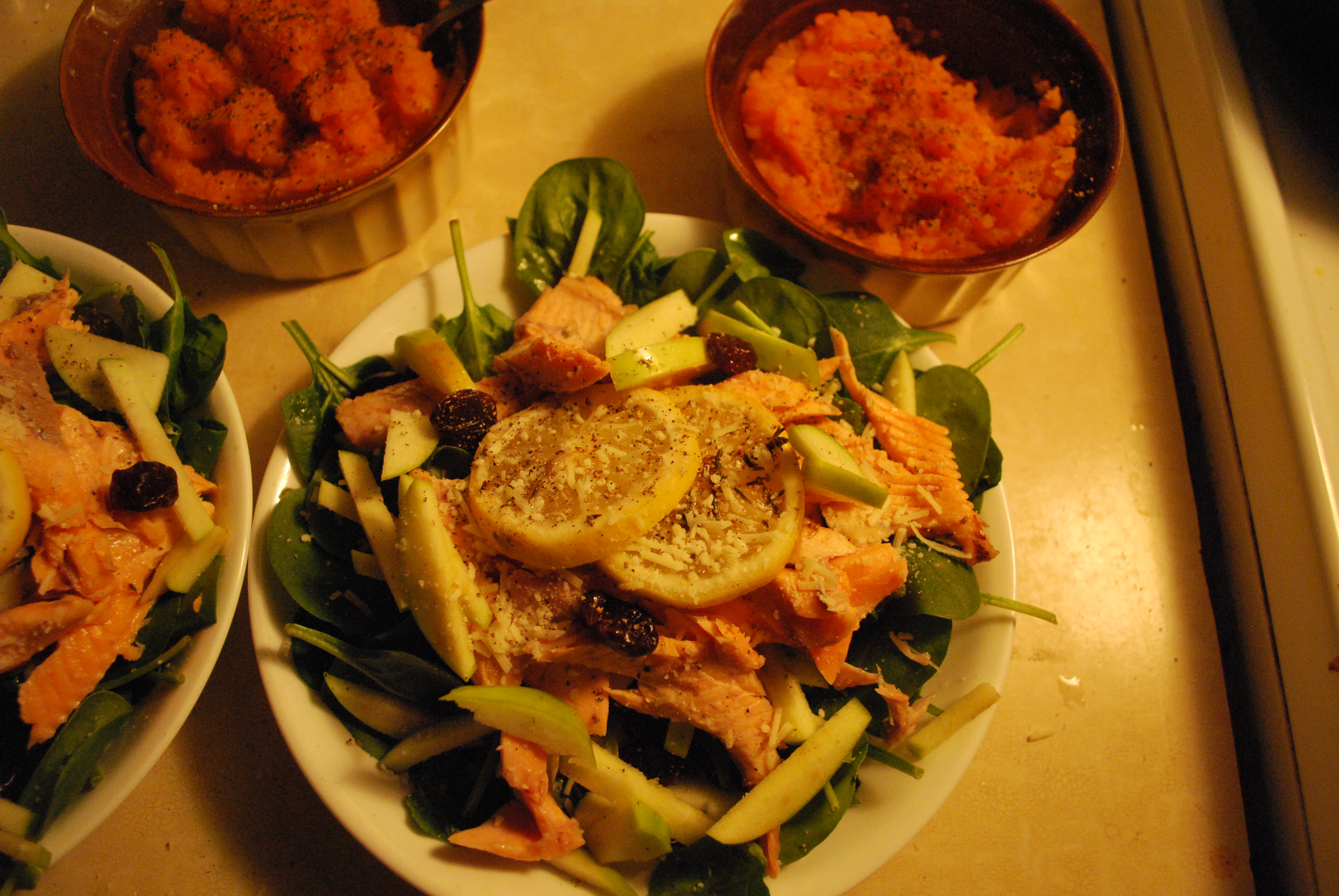 Ingredients:  Baked Idaho Rainbow Trout.  One 15 incher will feed 2 people, no problem.  Fresh Thyme, 2 tbsp.  One lemon.  Spinach, chopped green apples, dried cherries, asiago or other cheese, salad toppings of choice.