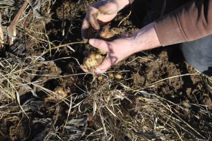 Our high mountain desert is brown and frozen. It seems as if there is nothing fresh to eat, but if we dig a little we can find a sweet little jewel – The Jerusalem artichoke also known as Sun Choke. Winter is the season to eat this exotically flavored rhizome. I think they are best eaten right after they have been dug up. You want to harvest the Jerusalem artichoke after the entire plant has died back all the way to the ground.  As I kneel in the cold winter dirt picking up Sun Chokes and letting frozen soil slip through my fingers, I imagine I am a native rooting for Camas root.