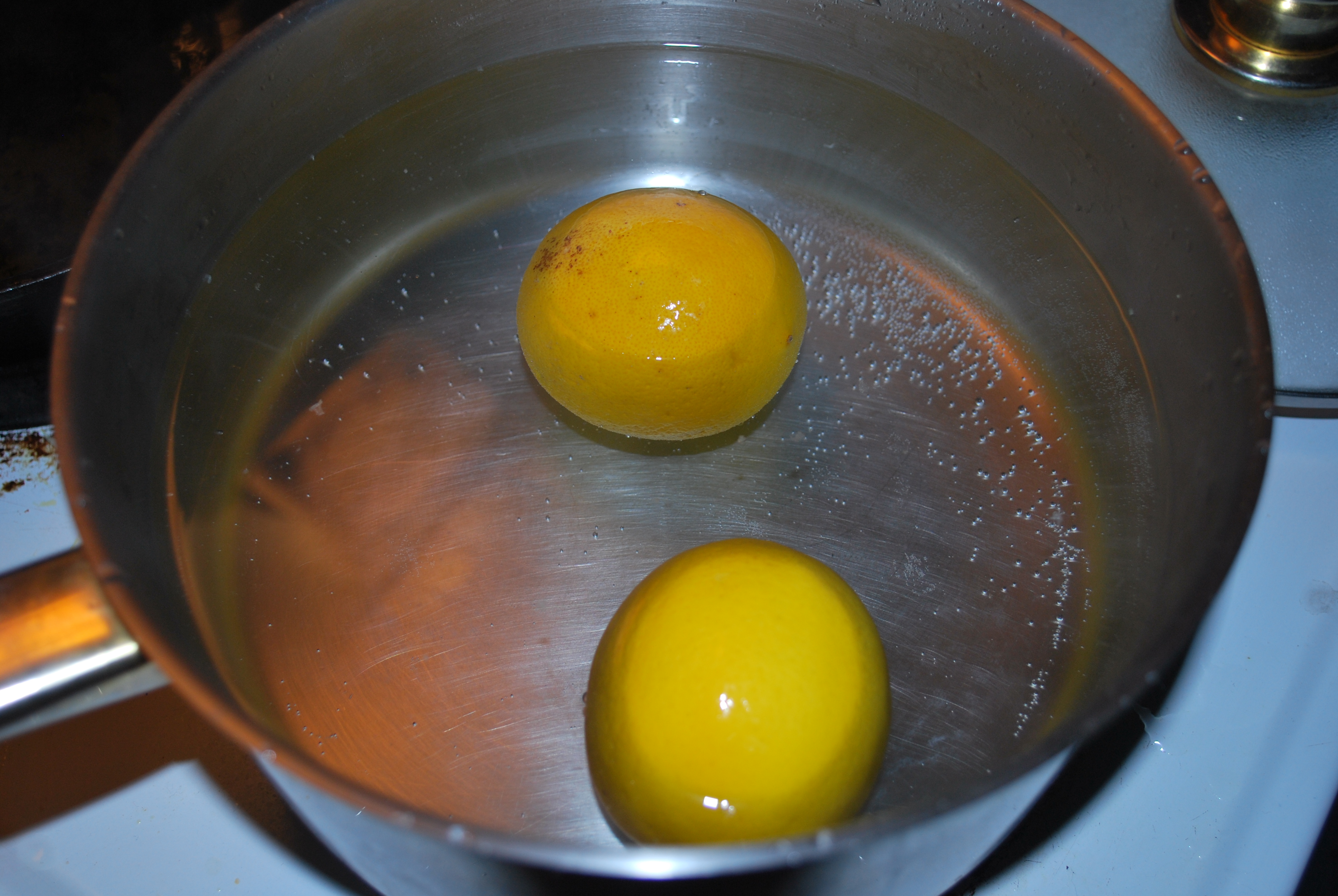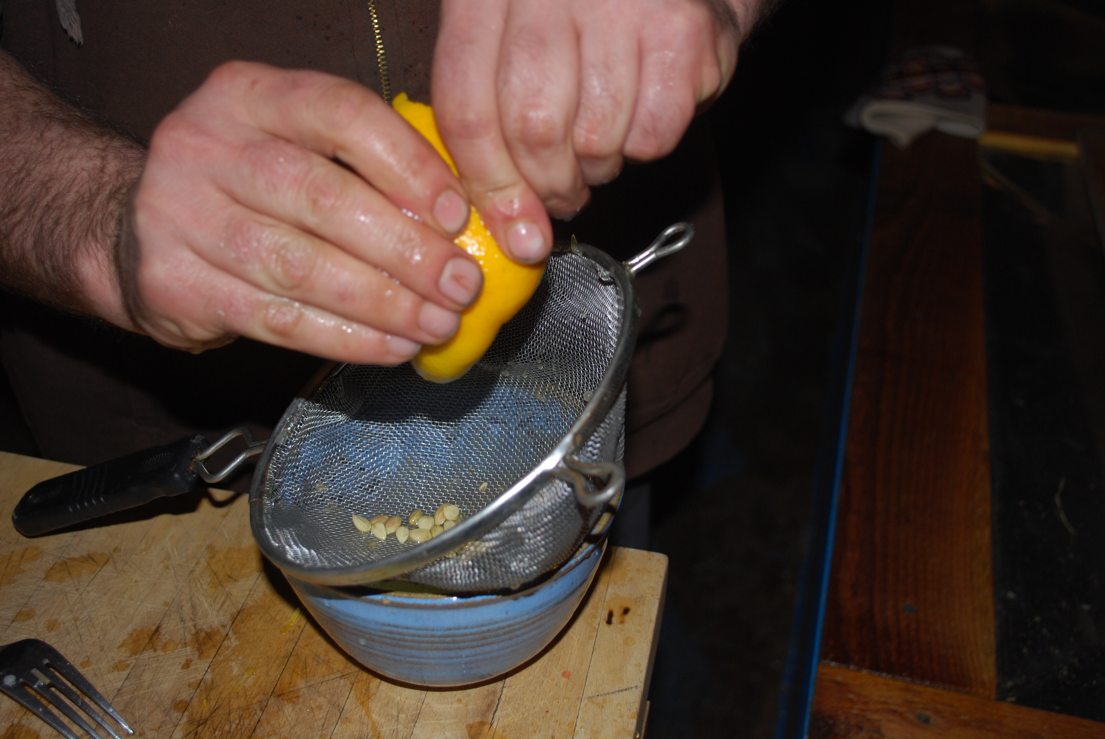 In order to get the most juice from these lemons, we heated them a little in hot water first, then rolled them around on the counter, firmly pressing with the palm of the hand, and then squeezed them out.