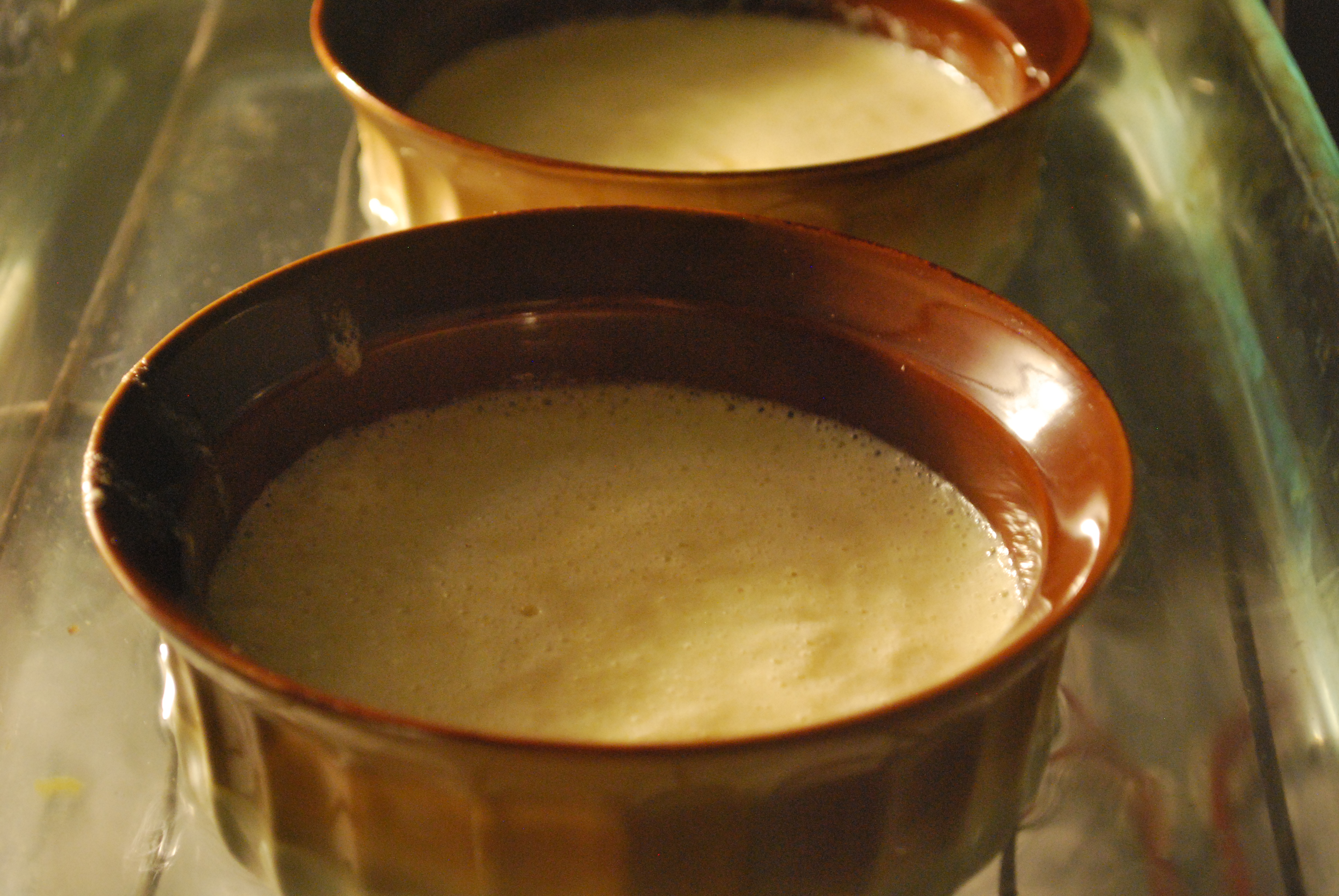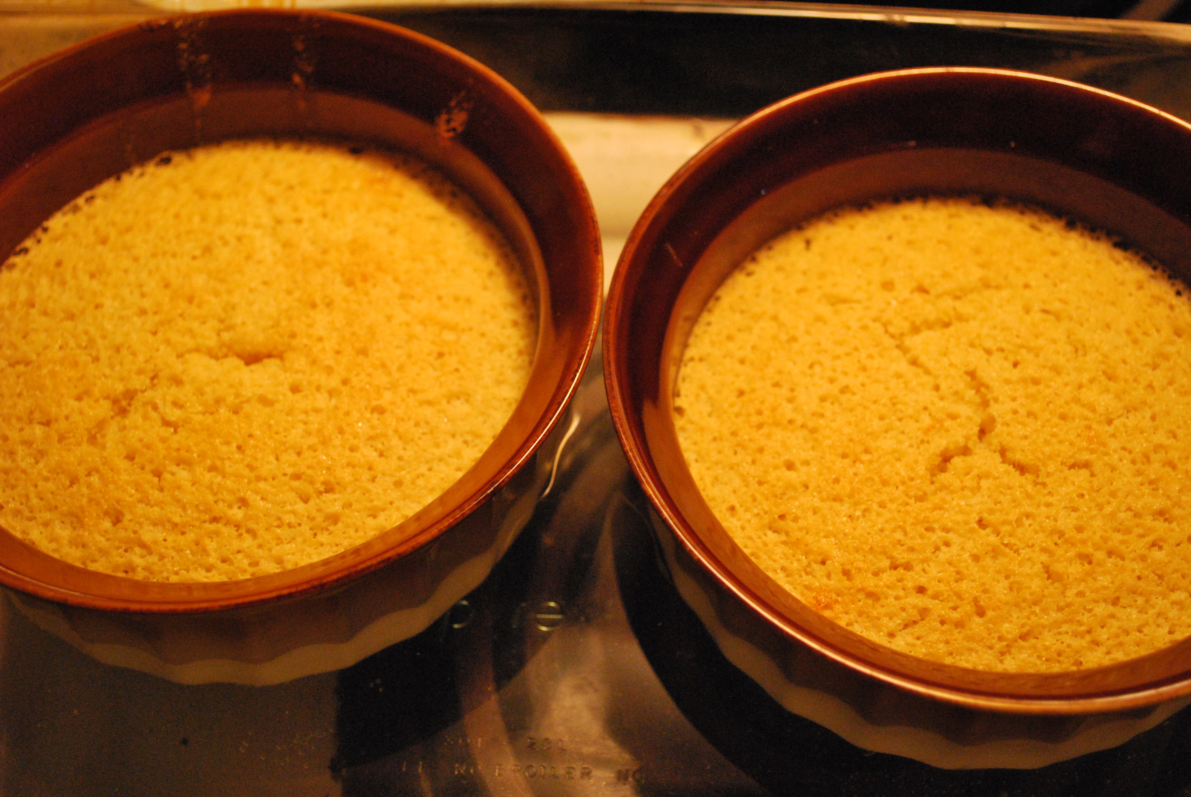 In separate bowl, beat 4 lg egg whites until stiff but still moist. Fold gently into batter. Ladle into oven safe custard cups. Bake in a water bath 30-40 min. Let stand 10 min in water bath before serving.