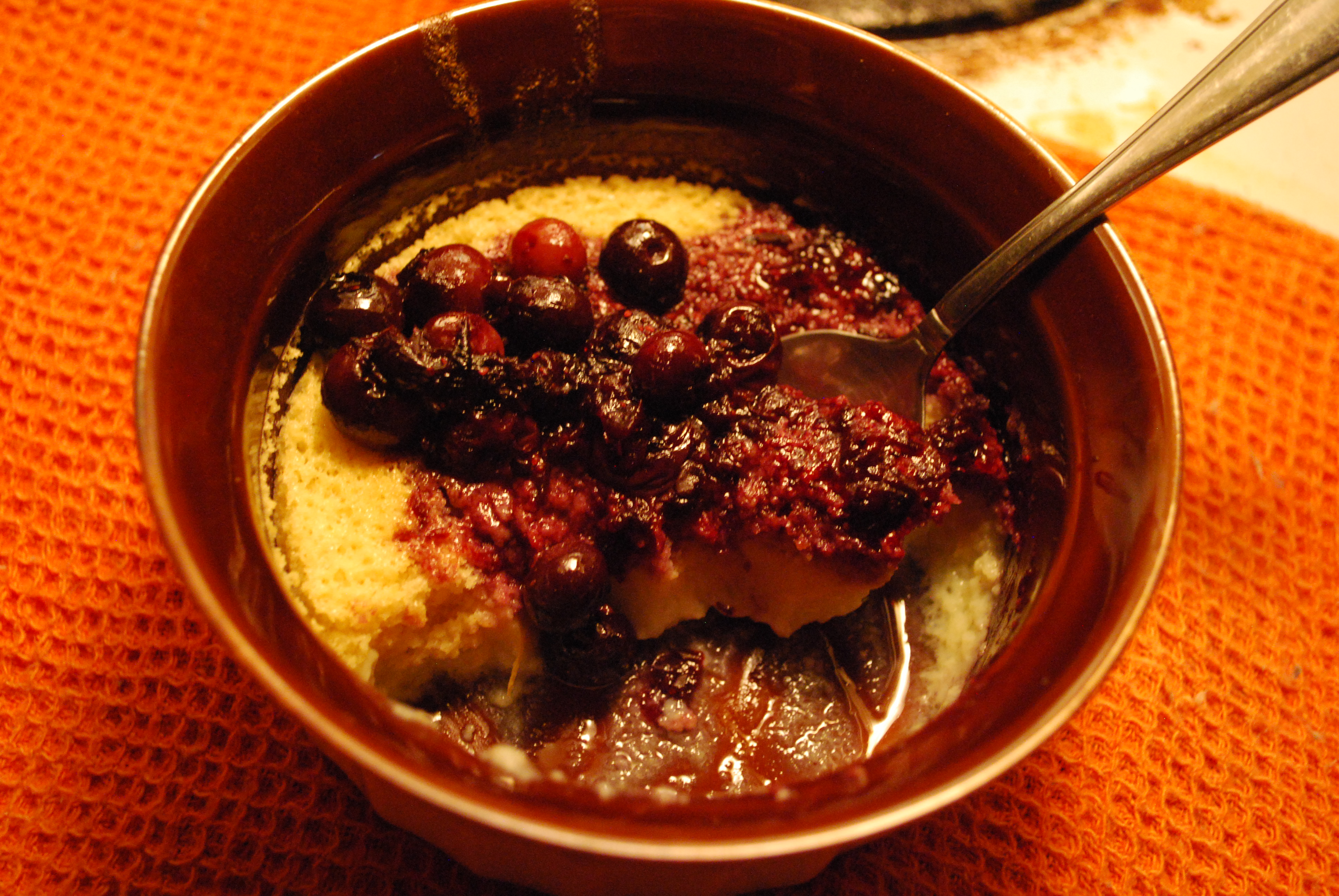 This dessert can be served hot, warm, or cold. JOY suggested topping it with raspberry sauce, but we only had blueberries in our freezer so used those instead: