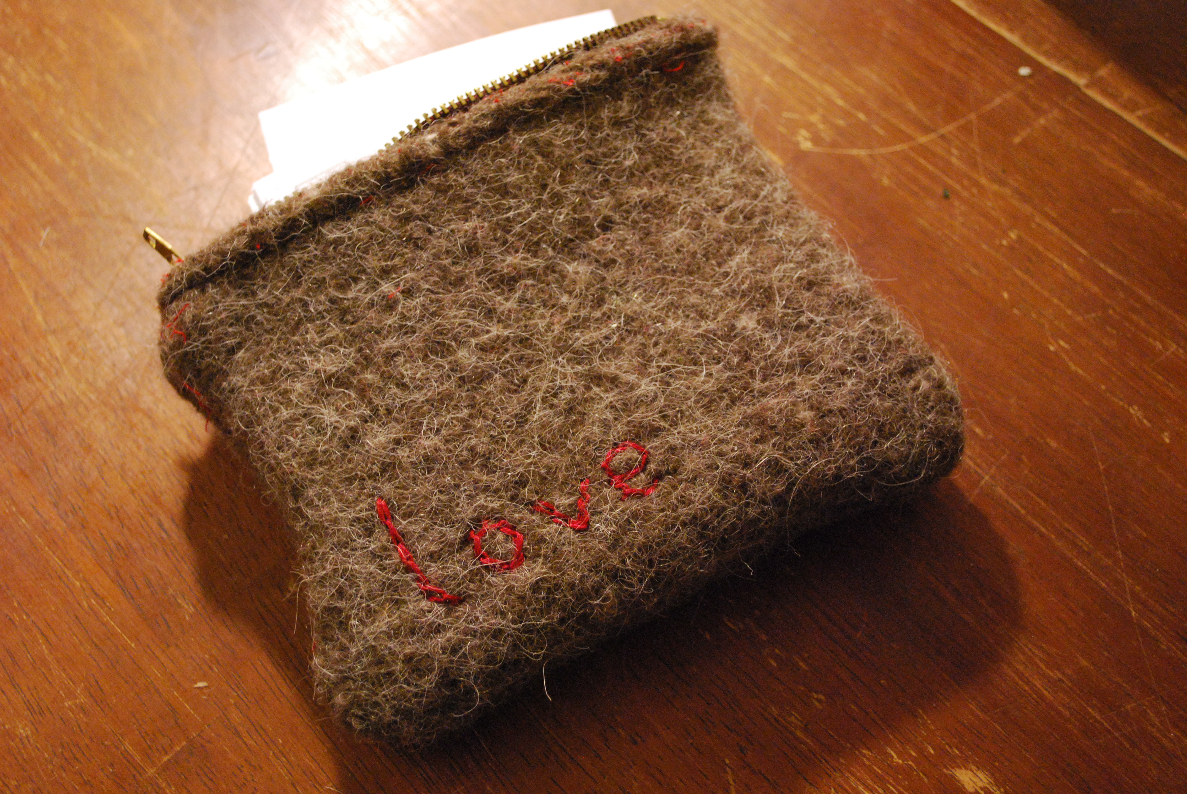 Then, when you cut them up, you have a nice thick wooly fabric that doesn’t unravel the way it would if you just cut up a sweater. I just made a little zippered pouch with a heart on it, for Marty to keep his oversize business cards in. Not bad for my first attempt and it didn’t take long to make, so I might try some more little dittys like this in the future.
