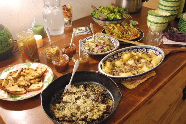 Farmer Marty recently got into an online discussion with local food writer Guy Hand. I’ll let Marty elaborate on that discussion, but the result was that we ended up inviting said writer over for dinner, along with some of our friends who are active in the local foods movement, including mushroom connoisseur Alex Hartman, urban farmer and expert canner/brewer/winemaker Casey O’Leary of Earthly Delights Farm, Earthworm Envy blogger Brandon Follett, and Flying M Pastry Chef Laura Shoemaker.