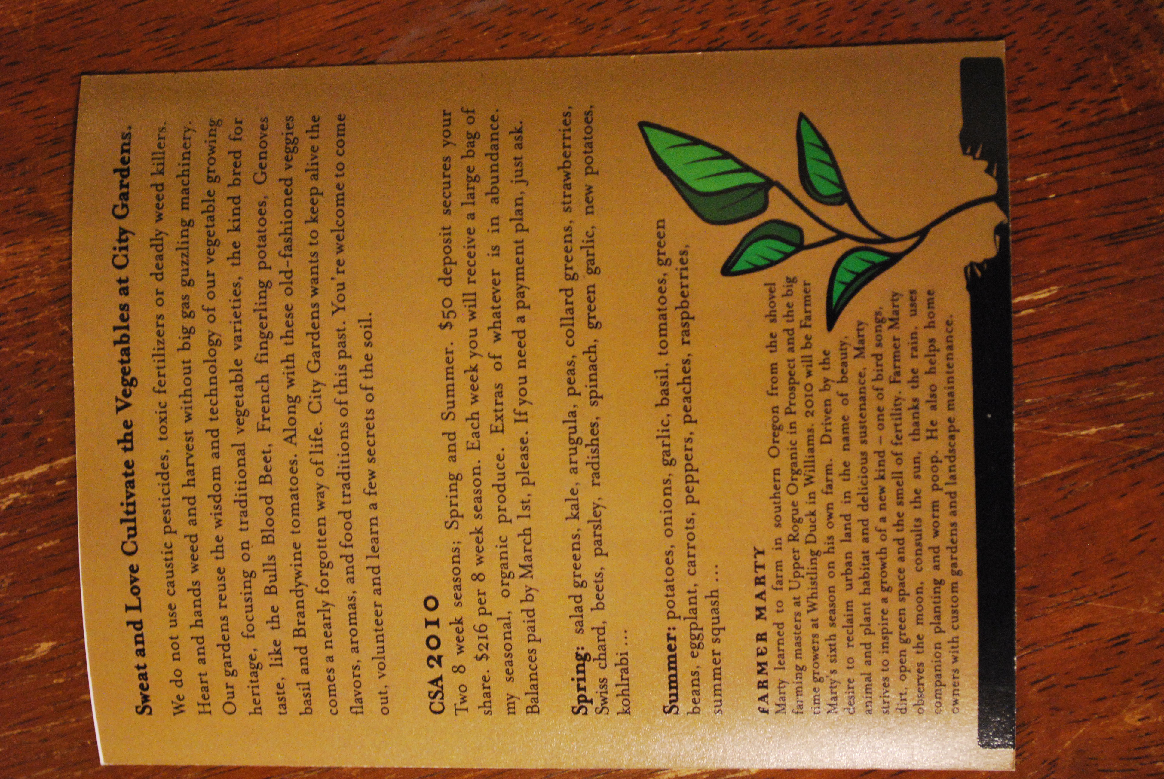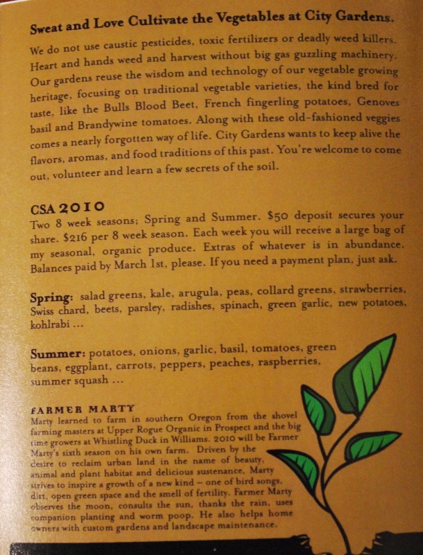 Now I have a small quarter sheet flier on City Gardens and nearly everyone has heard of Community Supported Agriculture. I don’t have to explain. Wow, this is great! So I thought.