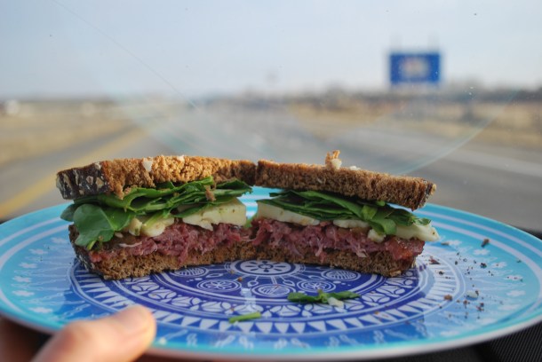 A good thing about sandwiches is that they’re easy to eat while driving.  Usually it’s my job to make sandwiches, while Marty drives.