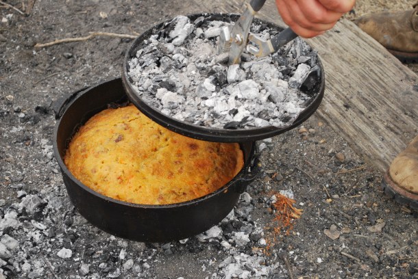 Add to the dry ingredients to make cake batter. Pour into a greased and floured 10 inch Dutch Oven and place over 12-13 charcoal briquettes with 10-12 briquettes on the Dutch Oven lid. (These directions are according to an ancient booklet of recipes Marty has, “Dutch Oven Cooking with Sourdough,” published by the Idaho Wheat Commission. We might recommend a little less bottom heat, and burning does seem to be a problem. Also, we used a 12 inch Dutch Oven, resulting in a thinner cake, which might be easier to cook without burning)