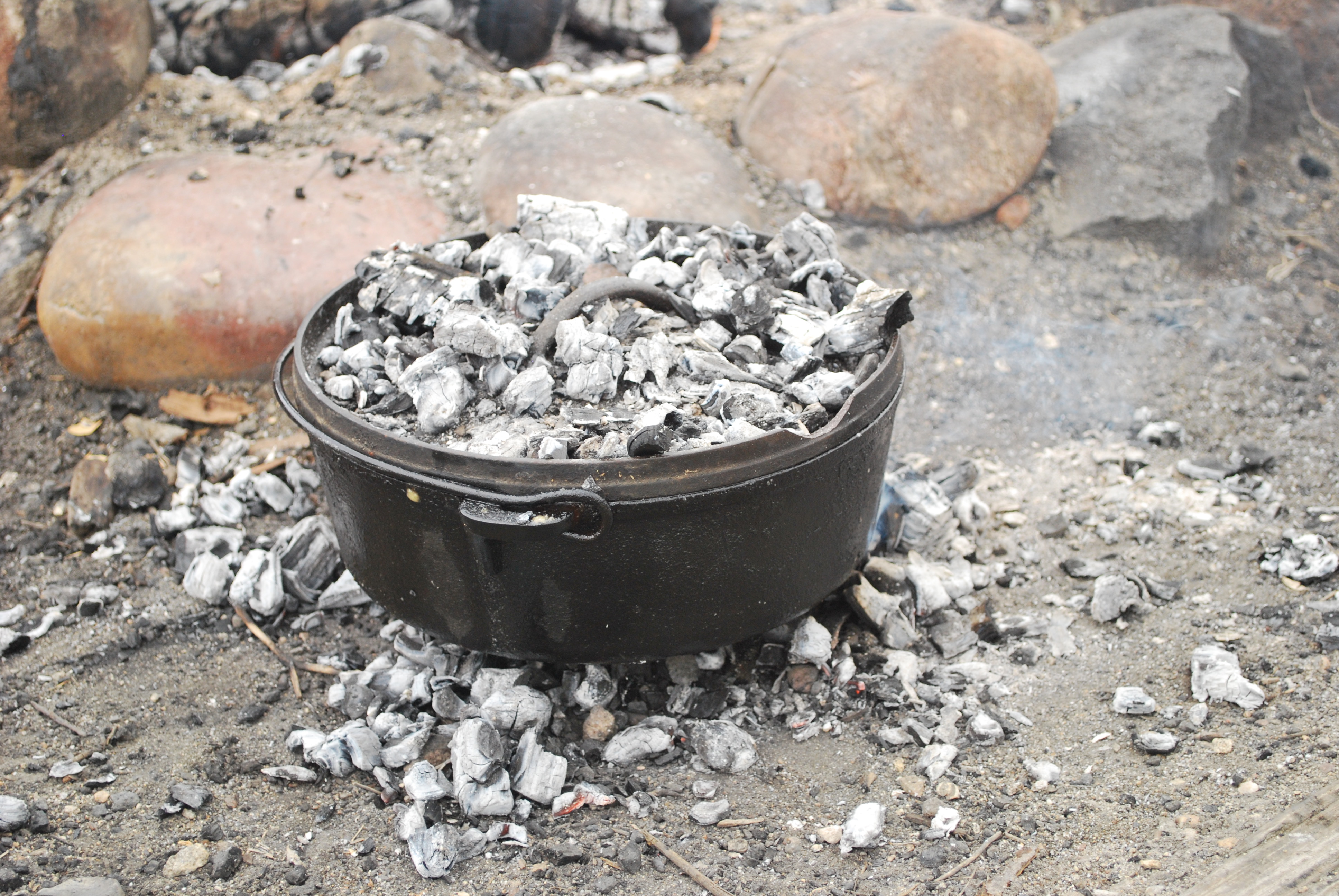 Mix in Dutch Oven. Put lid on and sit on coals. Lots of top heat. Let cook 45 to 1 hour. When it starts smelling really yummy you know it’s close to done.
