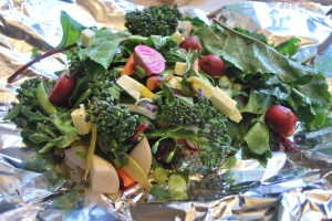 Summer is on! Marty and I have been super busy with the gardens, both combating the weeds and harvesting the bounty, which is the reason for our lack of blog posts of late. A lot of the time we’re so busy, and so overwhelmed by the garden’s offerings, that all we can do is throw everything into one pot and cook. Or in this case, into one aluminum foil packet.