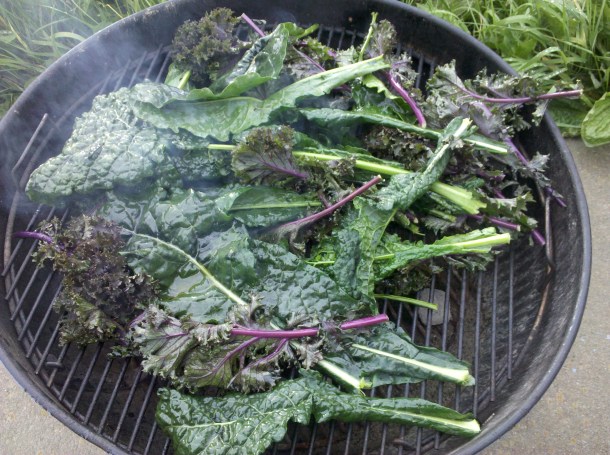 Wash kale and lay on a baking sheet. (Optionally, you can remove the stems from the kale.  I usually skip this step, but it’s supposed to make the kale less bitter.)  Drizzle oil over it, sprinkle with salt, and use your hands to coat both sides of each leaf in oil and salt.  Using tongs, grill both sides of each leaf on a hot grill until soft.  It can take longer than you think, but don’t let it burn.  It helps to keep moving it around.