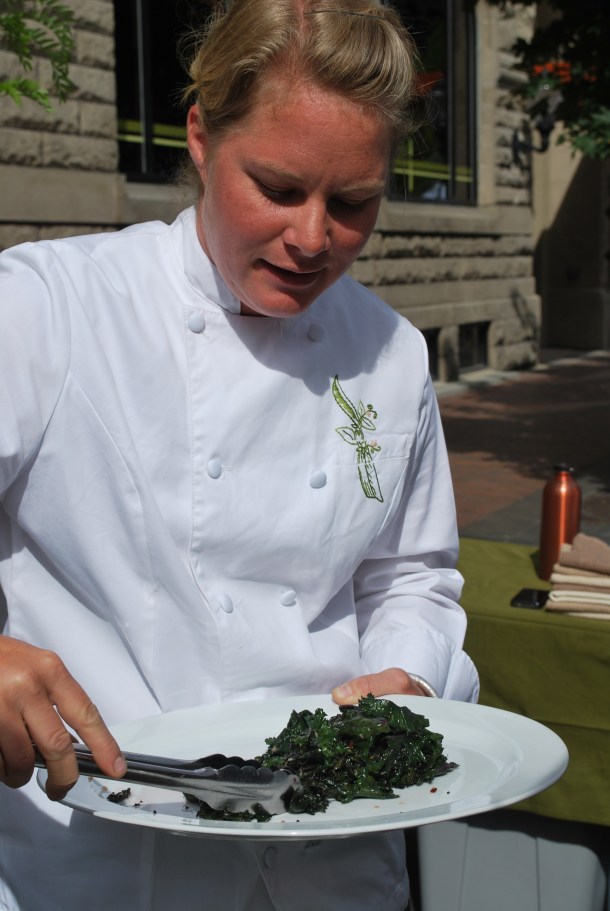 So, our second kale recipe this week comes from Abby Carlson, the chef-in-residence at the Peaceful Belly Farm. Let me tell you folks, when a farm has it’s own chef, you know they’re an awesome farm. Abby has been doing weekly cooking demonstrations at the Capital City Public Market, using produce from various vendors. I’ve watched a few of them and have been impressed because she usually makes very simple food, but I usually still learn something new from her demos. I also love the slick overhead mirror that lets you see everything she is doing, and the yummy samples! Her space is almost right across from ours on Idaho Street, so if you don’t have enough good reasons to come to the farmers’ market already, come check her out! I believe her sign says “Chef at the Market.”