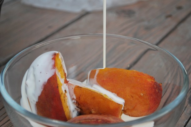 Quarter a couple of whole, fresh peaches, removing the pits.  Put them on your grill, peel side down.  We used our charcoal grill after we’d already cooked dinner, so it wasn’t extremely hot.  After a few minutes, turn so that both sides of the fleshy part get grilled.