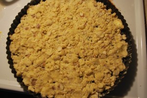 Beat butter, egg yolk, vanilla and sugar together. Combine almonds and flour and stir into butter mixture just until mixed and crumbly. I use my hands. Gather the dough into a ball if it’s sticky enough, then press small chunks of it into the bottom of a tart or pie pan. Bake for 15 minutes at 350 or until golden brown. (With only 15 minutes of baking time, this is a great hot summer day dessert.)
