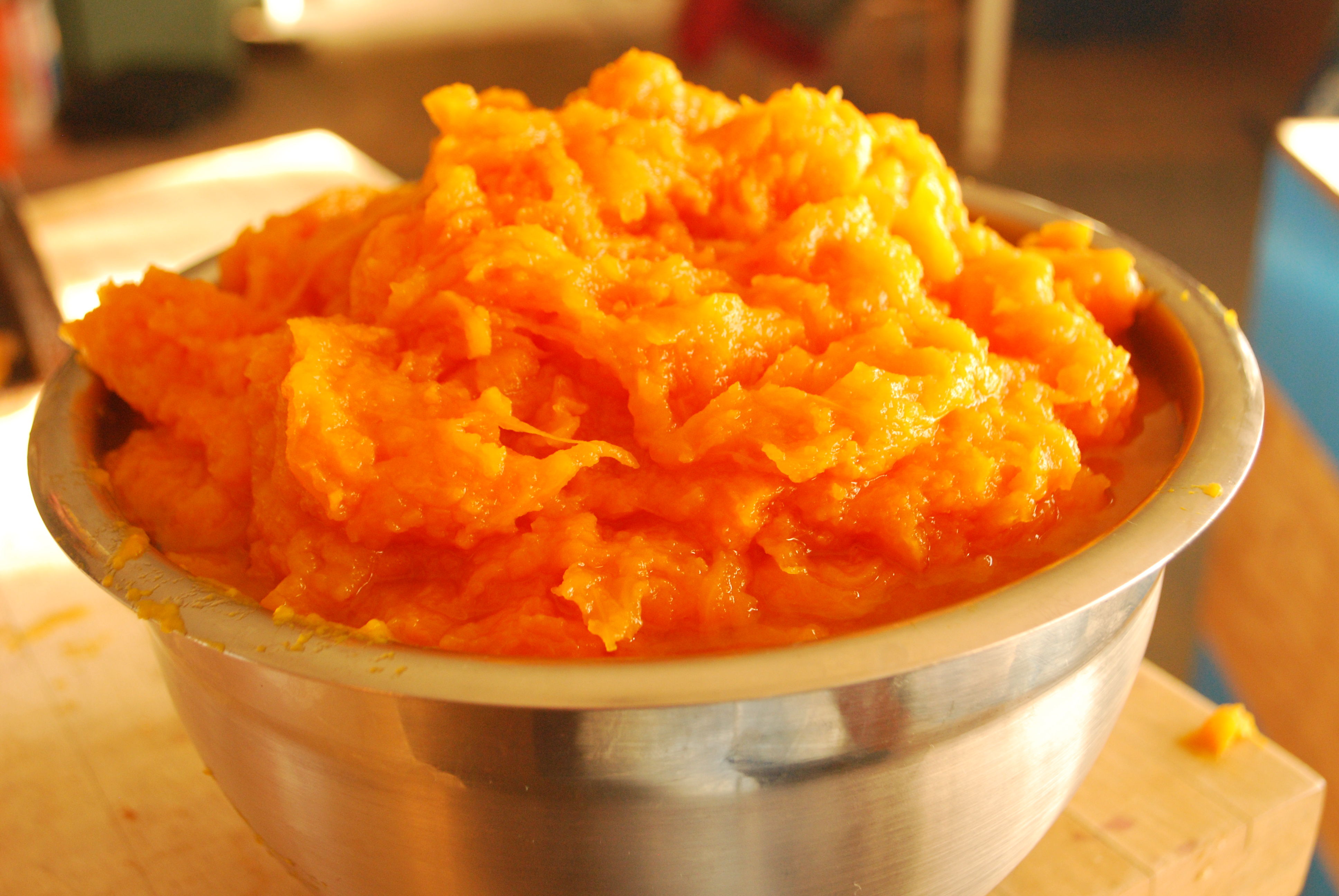 Most recipes for pumpkin pie, bread, etc., call for canned pumpkin. But I’ve got a mountain of fresh pumpkins here, so why eat something out of a can? When I want to cook with a real pumpkin, or a winter squash, I take the whole thing, seeds and all, and put it in the oven and bake at 350 degrees until soft. Supposedly baking it with the seeds inside enriches the taste of the pumpkin, and it eliminates the need to cut, seed, or peel a very hard pumpkin or squash, which can be dangerous! When it’s done, take it out and let it cool. Then it will be easy to cut and remove the seeds and peel.