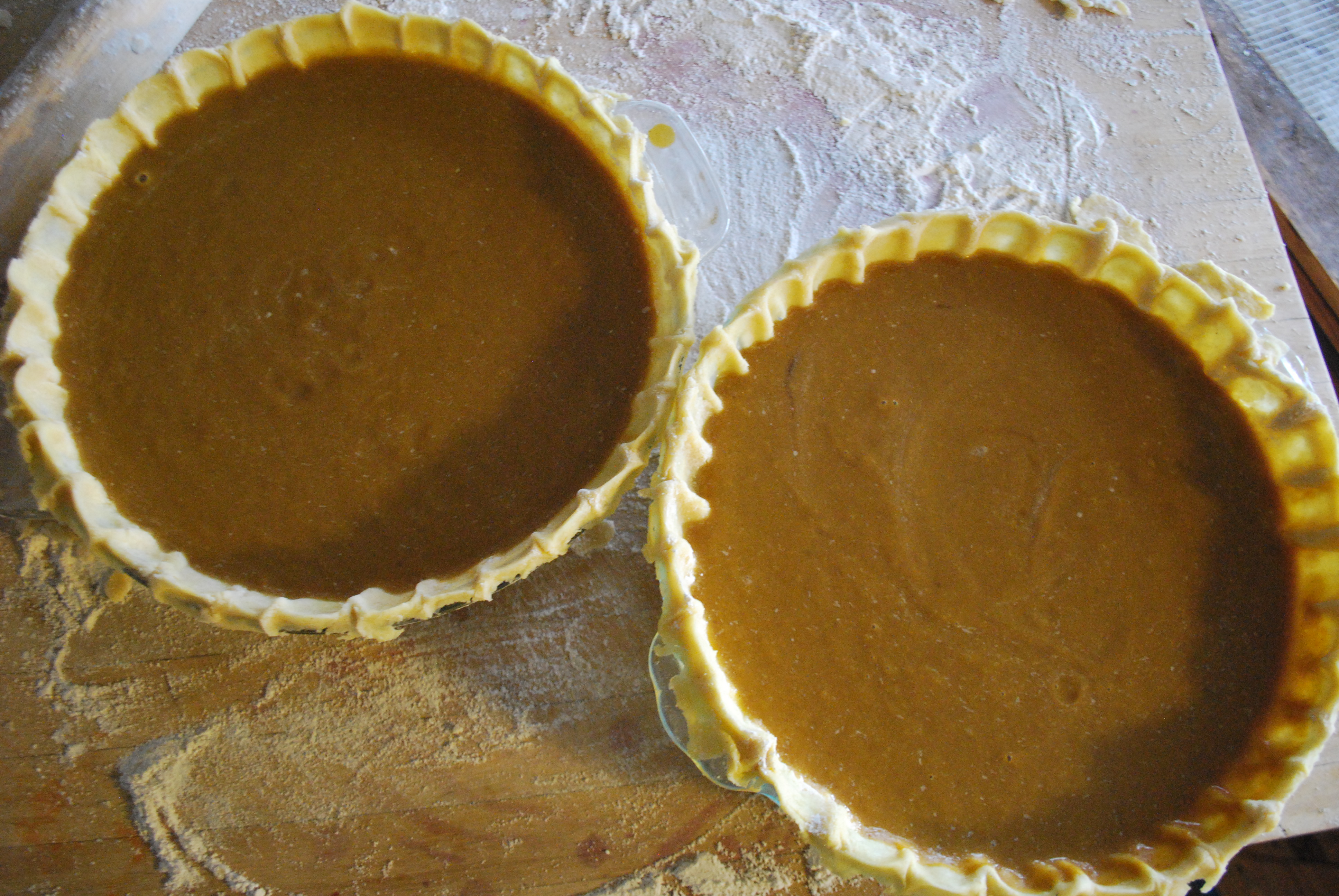 Puree your pumpkin in the food processor, then add the rest of the ingredients to the food processor. I add the milk last, and be careful, because at least with my food processor, it usually overflows a little bit. Pour the filling into the crusts and bake at 400 for 15 minutes, then reduce the heat to 350 for another 30 to 40 minutes. (If you forget to reduce the heat your crusts may burn. You can probably just bake it at 350 for a longer time, if you think you will forget.)