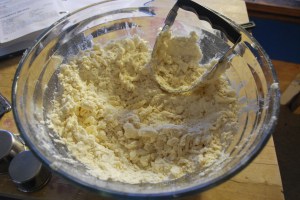 Mix flour, sugar, and salt in a large bowl. Add Crisco and mix until crumbly. I recommend using a pastry cutter, makes it much easier, but you can also use a fork or your hands. At this point, you can’t overmix and want the Crisco to be completely worked in.