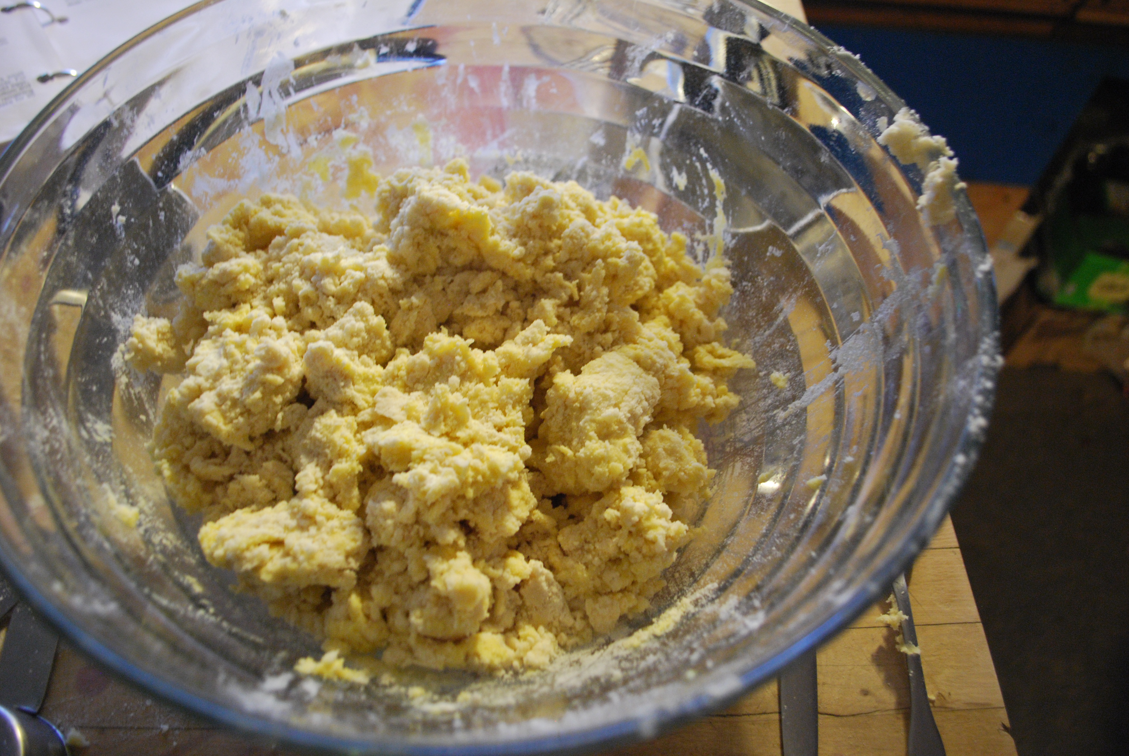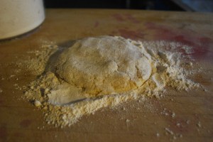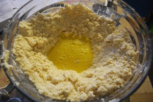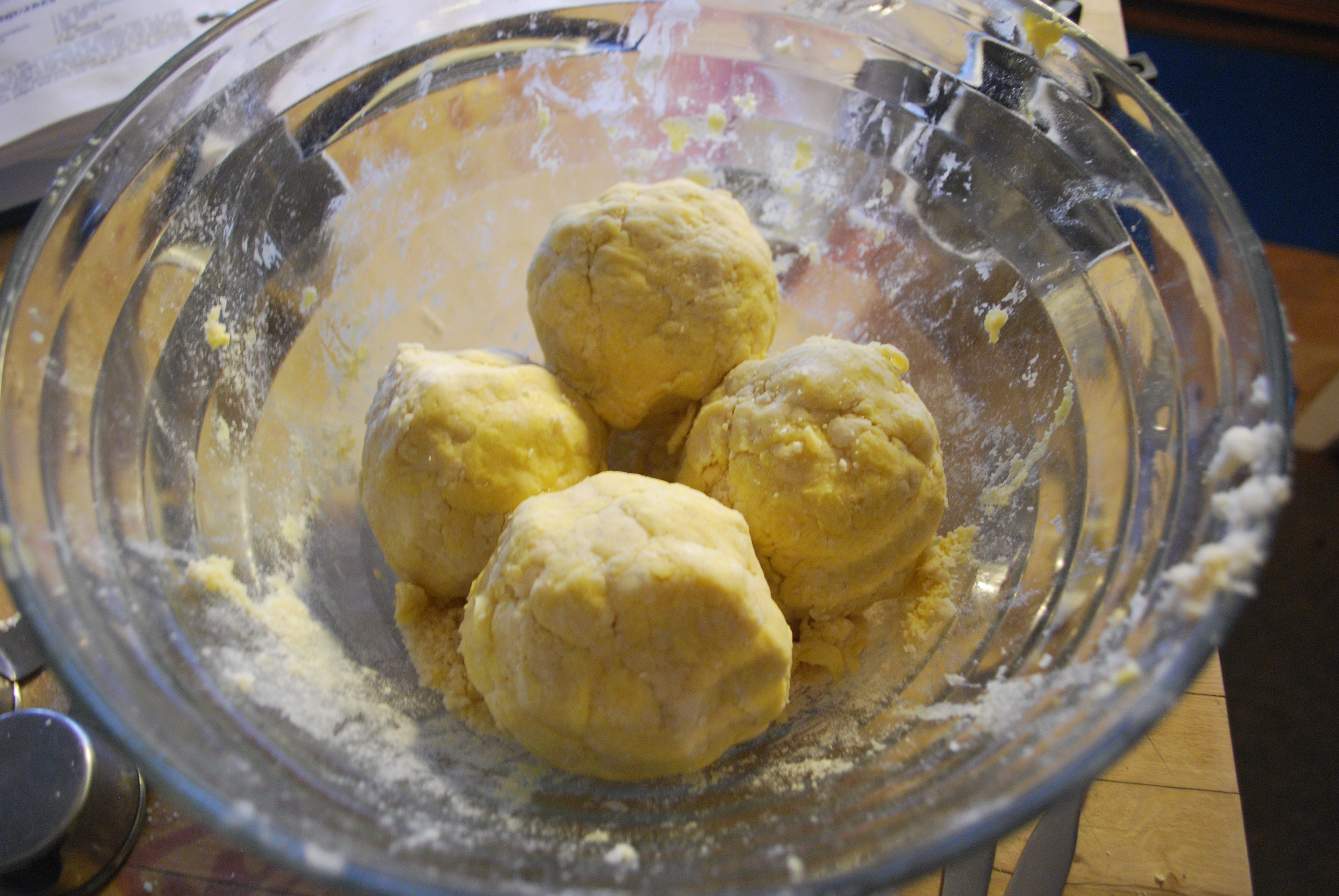 Next, mix the water, eggs, and vinegar in a separate bowl. Make a well in the center of your flour/Crisco mixture and pour your wet ingredients in. At this point, it’s very easy to STIR TOO MUCH. So, carefully blend the dry into the wet, I usually use a fork. You want to get it to the consistency just where it will stick together, then make four relatively equal sized balls with your hands. There will be some scraps of flour left in the bottom, don’t worry about these and don’t try to force them to stick to the balls.