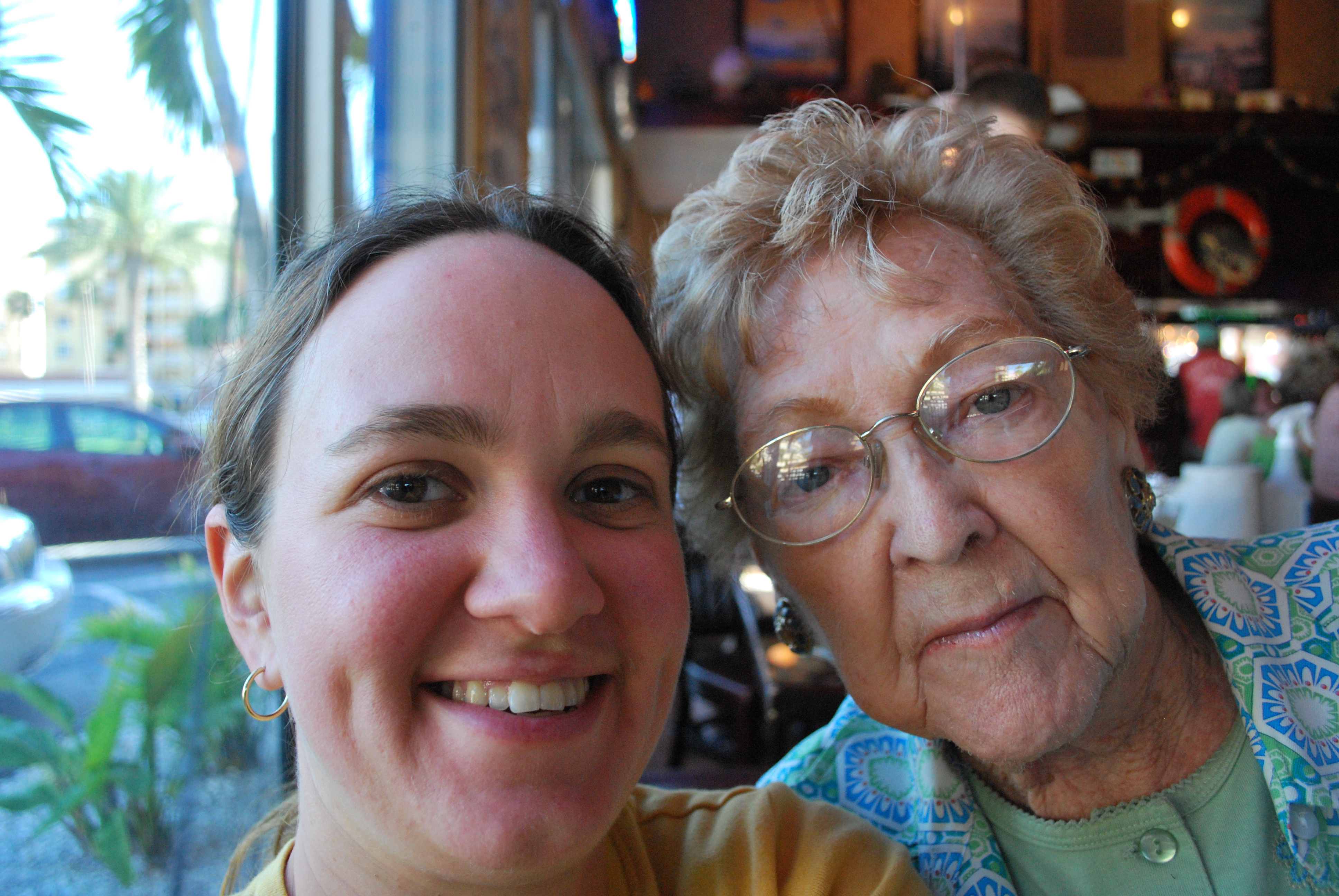 Baking pies always reminds me of my grandmother, Lottie Painter. She and my grandfather were the proprietors of a small restaurant for years, where she baked some very popular pies. The restaurant had already been sold by the time I was a child, but I have wonderful memories of trying to learn to duplicate my grandmother’s pie crusts. To be fair, this wasn’t her original recipe. She used lard, which is a little harder to pull off, but delicious. But the technique is hers. In her later years, she too used pre-made crusts sometimes. When I was a graduate student in Florida, I used to drive down to her Gulf Coast condo to visit her, and she would often serve me a meal of entirely pie: a meat and potato filled pie for dinner, and apple pie for dessert. This is us in 2009.