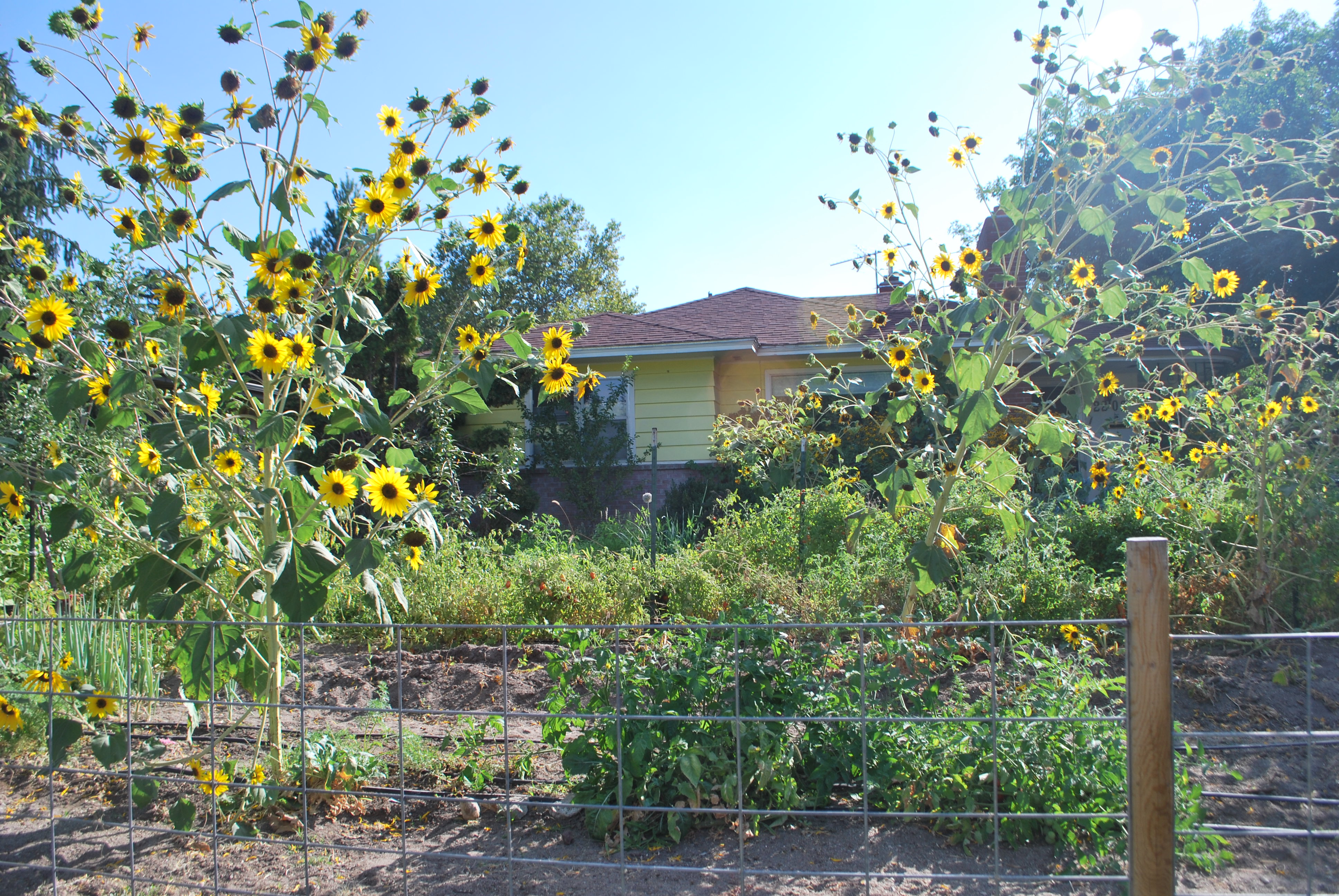 Another garden that I loved in my neighborhood took advantage of the median strip between the sidewalk and the street.  They grew quite a lot of food in raised beds, with low-maintenance rocks in between, and probably took advantage of the sunniest part of their yard.  I don’t know who owned this garden (let me know if you do!), I think it was around 24th and Bannock or so.  In the photo you can see how they covered one bed with bendable PVC and row cover for frost protection.
