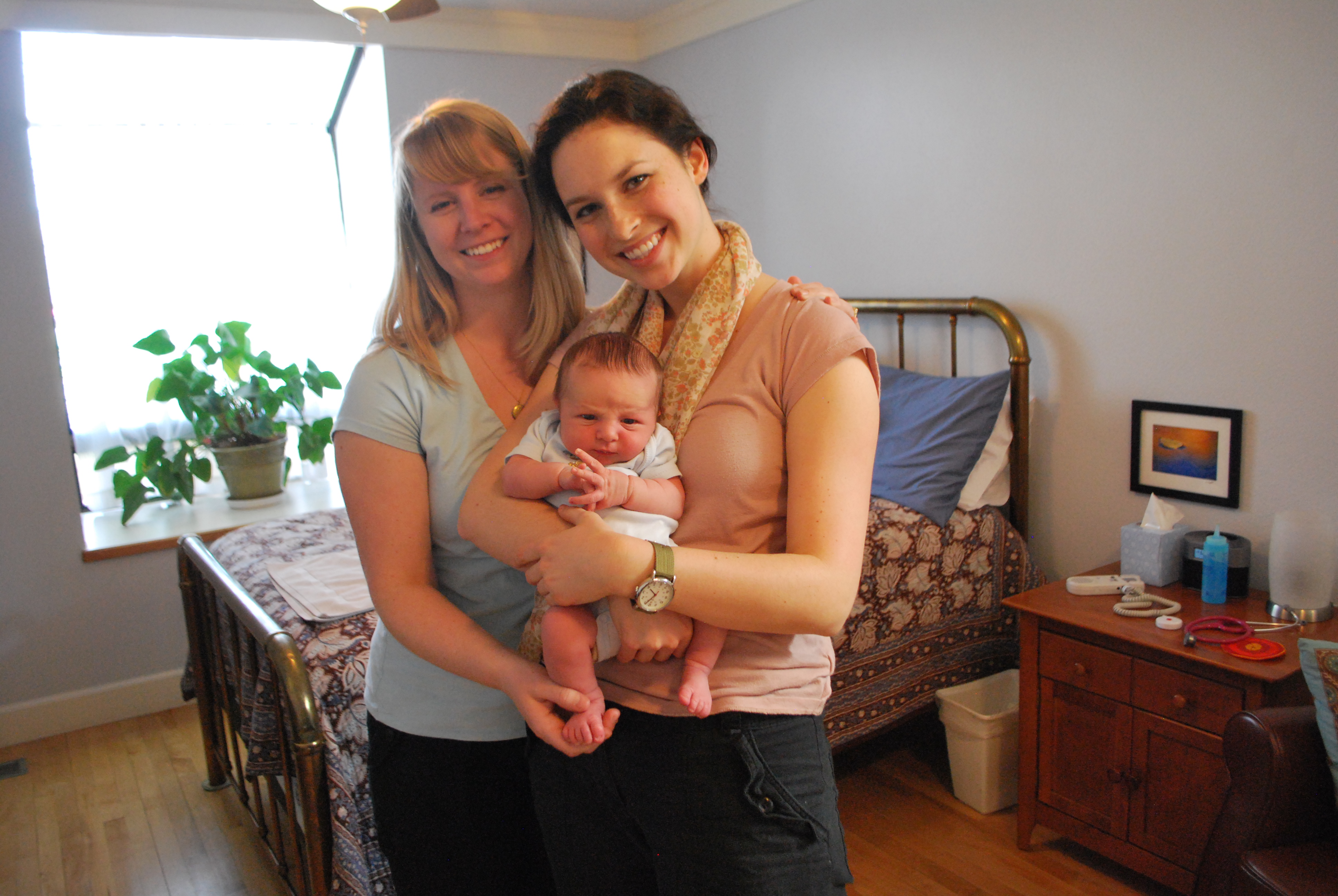 So…we labored like this for a long time and by around 1 am, I was fully dilated and ready to start pushing.  The dilation stage went fairly normally for a first birth, though it took a while.   The pushing stage lasted an even loooonger while, and this was definitely the more difficult part.  As the hours wore on, the midwives coached my pushing pretty directly, putting me in many different positions, and even touching points inside me and directing me to push toward those points, which helped a lot.  Because the baby was badly positioned, they had me alternate between lots of different positions that they thought might help, including squatting, laying on my side with someone holding one of my legs up in the air, and using the birthing stool.  None were very comfortable, but as long as I kept moving and changing positions, everything seemed fine.  Sometimes they seemed convinced the baby was about to be born, and other times, doubting whether I was making any progress at all.  Apparently because Rio’s head was turned to the side, he had trouble fitting under my pubic bone, and would come down a little bit and then regress.  A few times I thought I could feel his head getting closer.