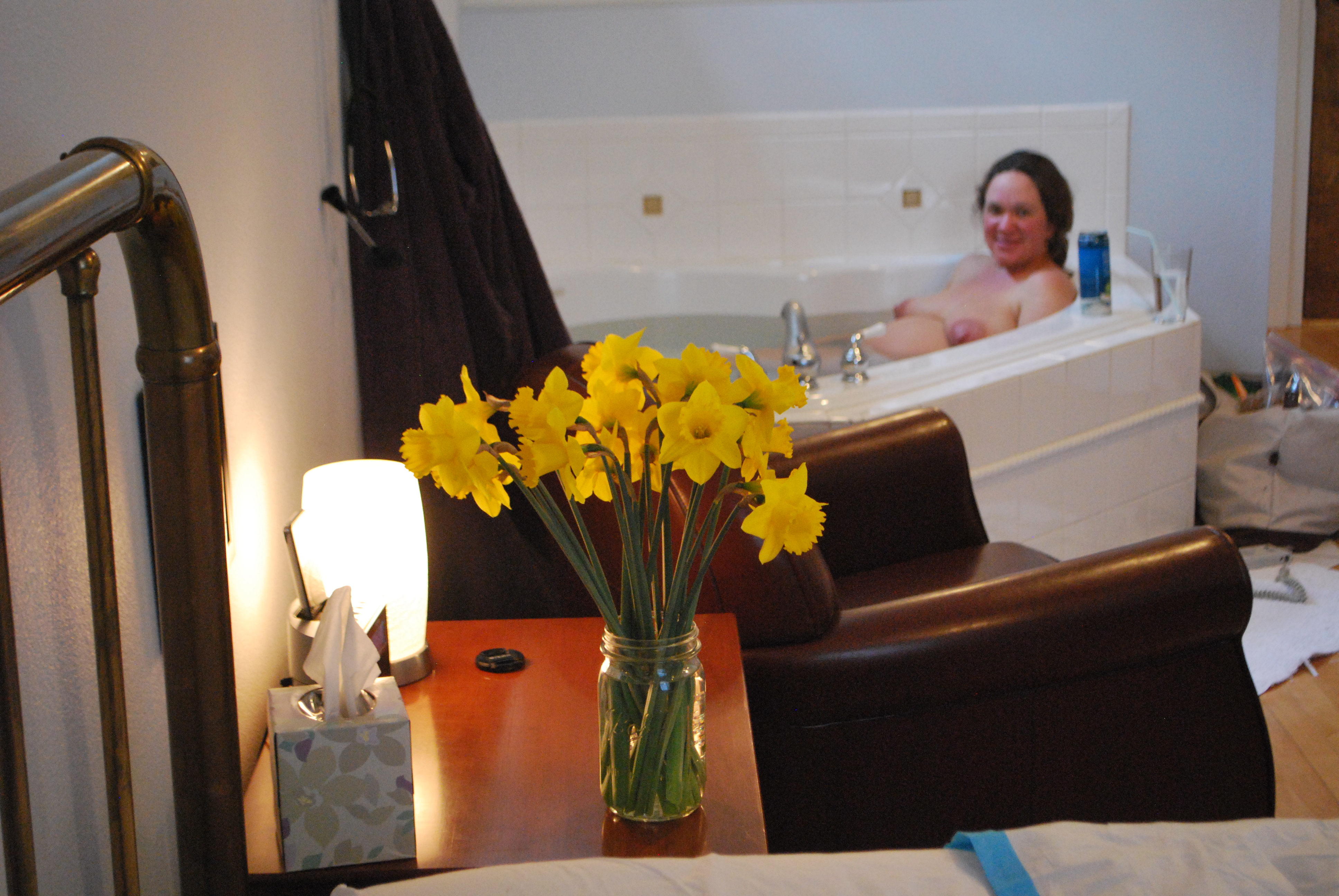 Laboring in the tub...daffodils from our yard, who knew they smelled so good?
