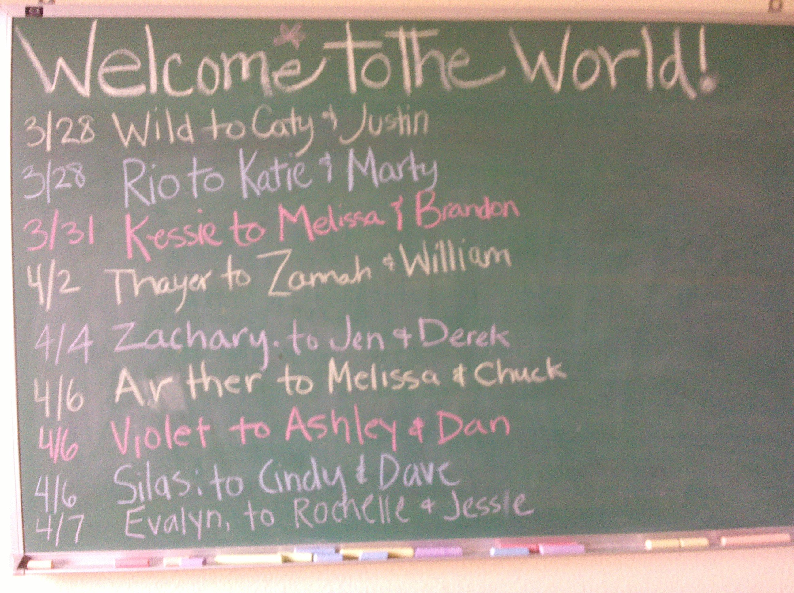 Rio’s water broke around 2 am on Monday, March 26.  It was a relatively small amount of liquid and continued trickling out throughout the day.  We had an appointment with the midwives who confirmed that it was amniotic fluid, and that his labor should begin soon, and would have to be underway within 72 hours to avoid an induction.  We waited around ALLLL day that rainy Monday, went to Costco, Marty bought razors and shaved his beard so he could meet the baby clean-shaven,  made a few last minute preparations for what to take to the birth center, saw a movie at the Flicks (Friends with Kids) to distract ourselves for a few hours.