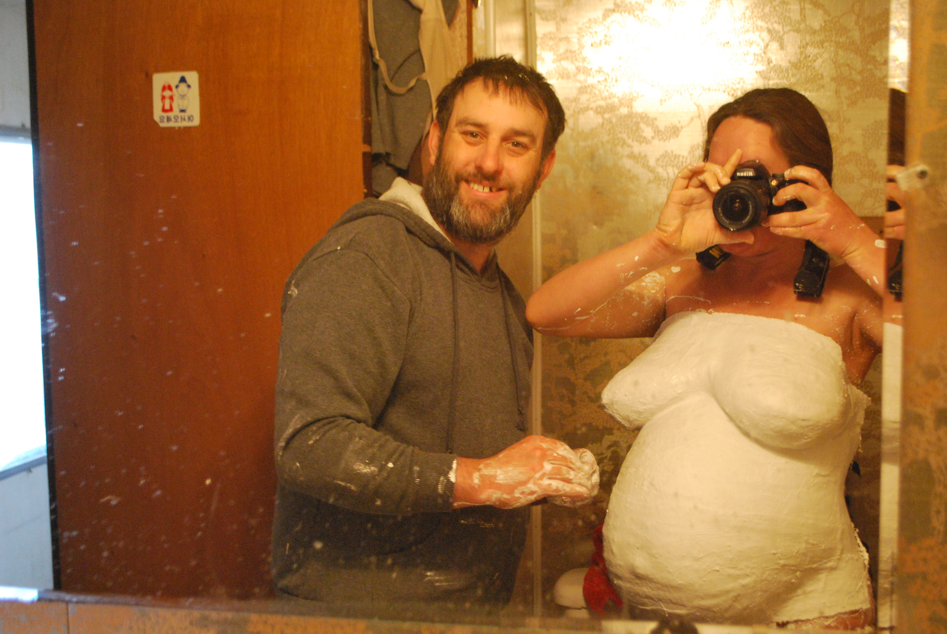 Grease belly generously. Get a flat pan, fill with water. Cut some strips into the size you want. The person being casted should hold very still while the other person applies several layers of strips to the belly. As the plaster begins to dry, you really have to hold still, so taking these photos was kind of difficult. Ladies, you will be amazed a the care and attention your partner may take at applying something smooth and wet to your bare, well, you see what’s going on here. You’ll have to stand there till the plaster is mostly dry, and then pull the whole thing off!